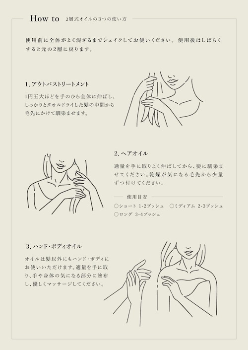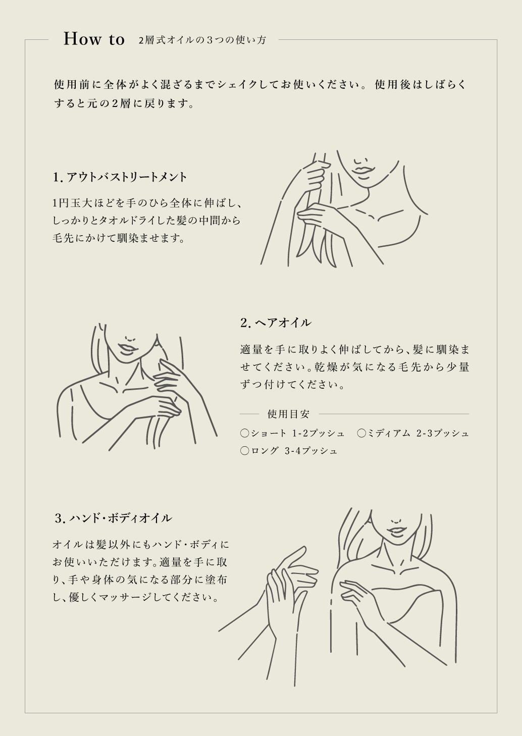 適量を手のひらにでよく伸ばして毛先を中心に塗布し、毛髪全体に馴染ませてください。均一になるまでよく振ってからご使用ください。適量を手にとり、髪や肌にムラなくのばしてください。タオルドライ後の毛髪に塗布していただくとより効果的に仕上がります。使い始めは、垂直に振っても混ざりにくいため、ピンクの層が上を向くように「逆さ」もしくは「横向き」に振っていただきますと均一に混ざりやすくなります。