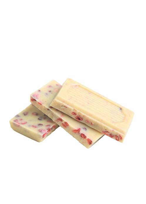 甘酸っぱいラズベリーのつぶつぶ果肉がたっぷり、とろけるホワイトチョコ。